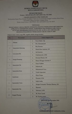 KPU Kota Samarinda merekrut 55 orang untuk melaksanakan Sosialisasi dalam rangka meningkatkan kualitas pemilihan umum tahun 2019. Pada tanggal 2 Februari 2019 diadakan pengukuhan dan bimtek relawan demokrasi. Acara yang dibuka langsung oleh ketua KPU Kota Samarinda , Ramaon Dearnov Saragih. Pada